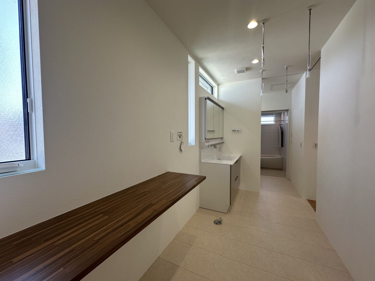 3LDKのお家で考えられた脱衣スペースがあり広々とした窓で開放感のあるお家となっており、
