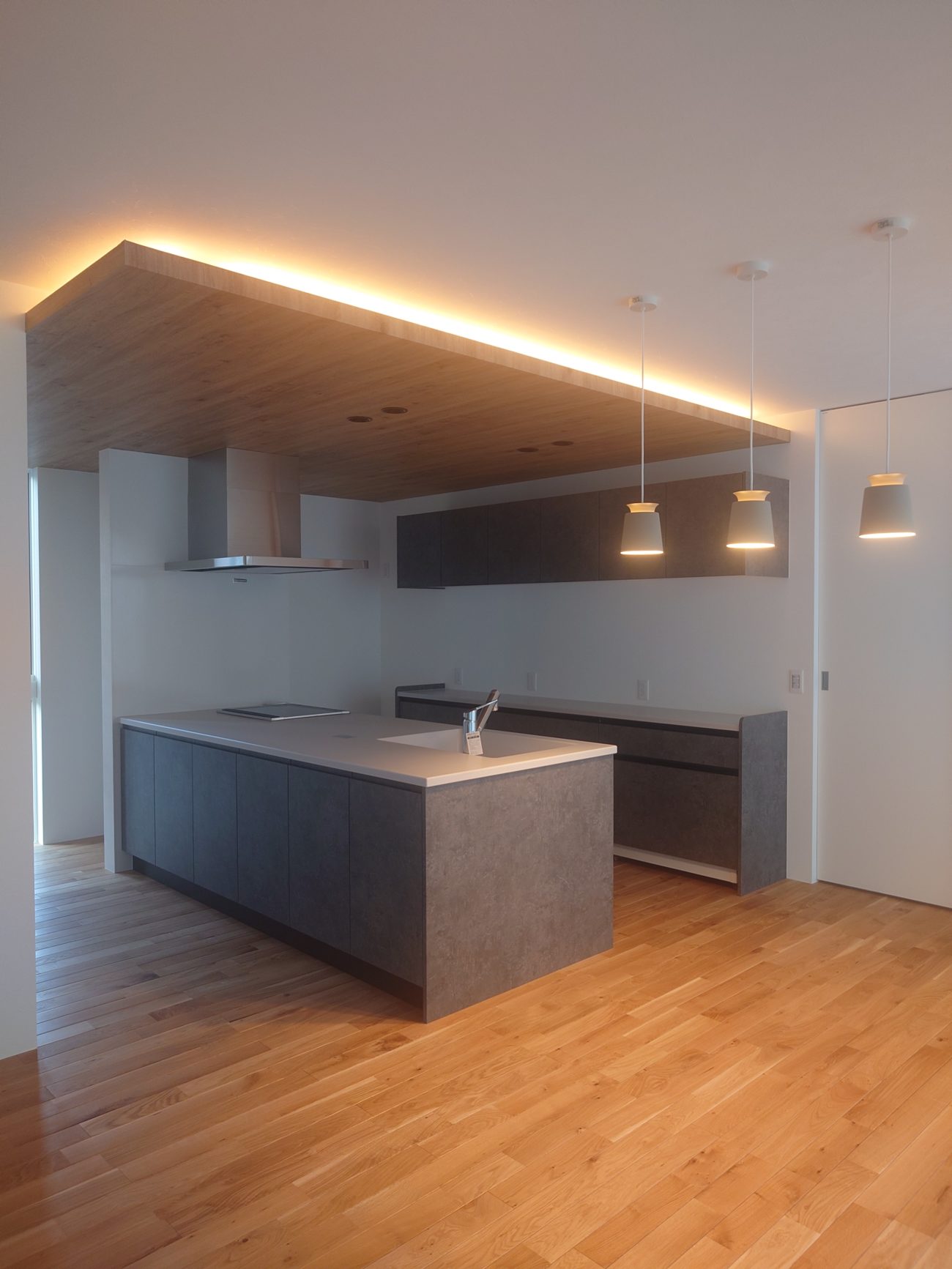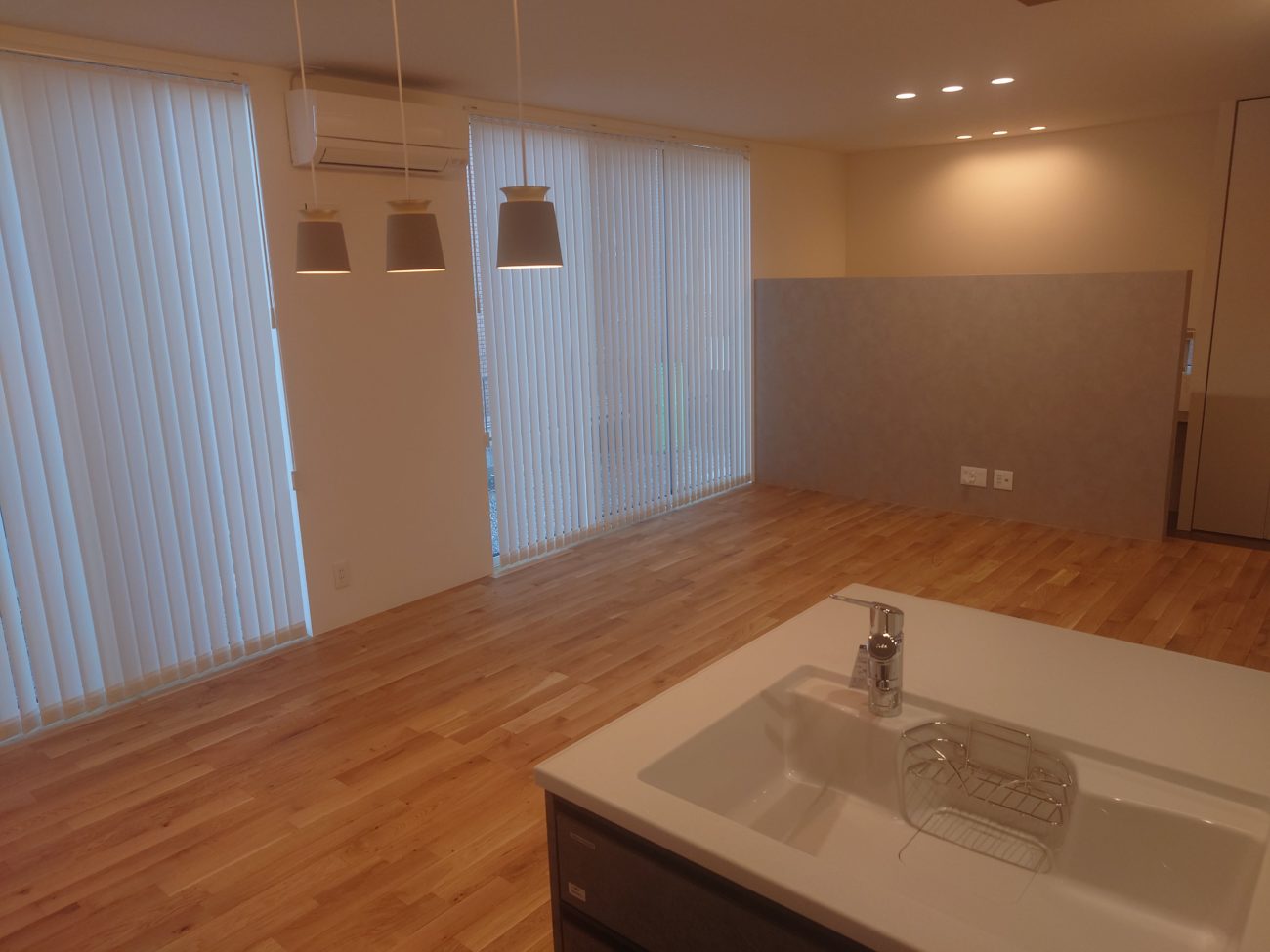 玄関から入るとすぐ20帖のLDKが広がっていて、キッチンも広々!拘りの照明で素敵です!