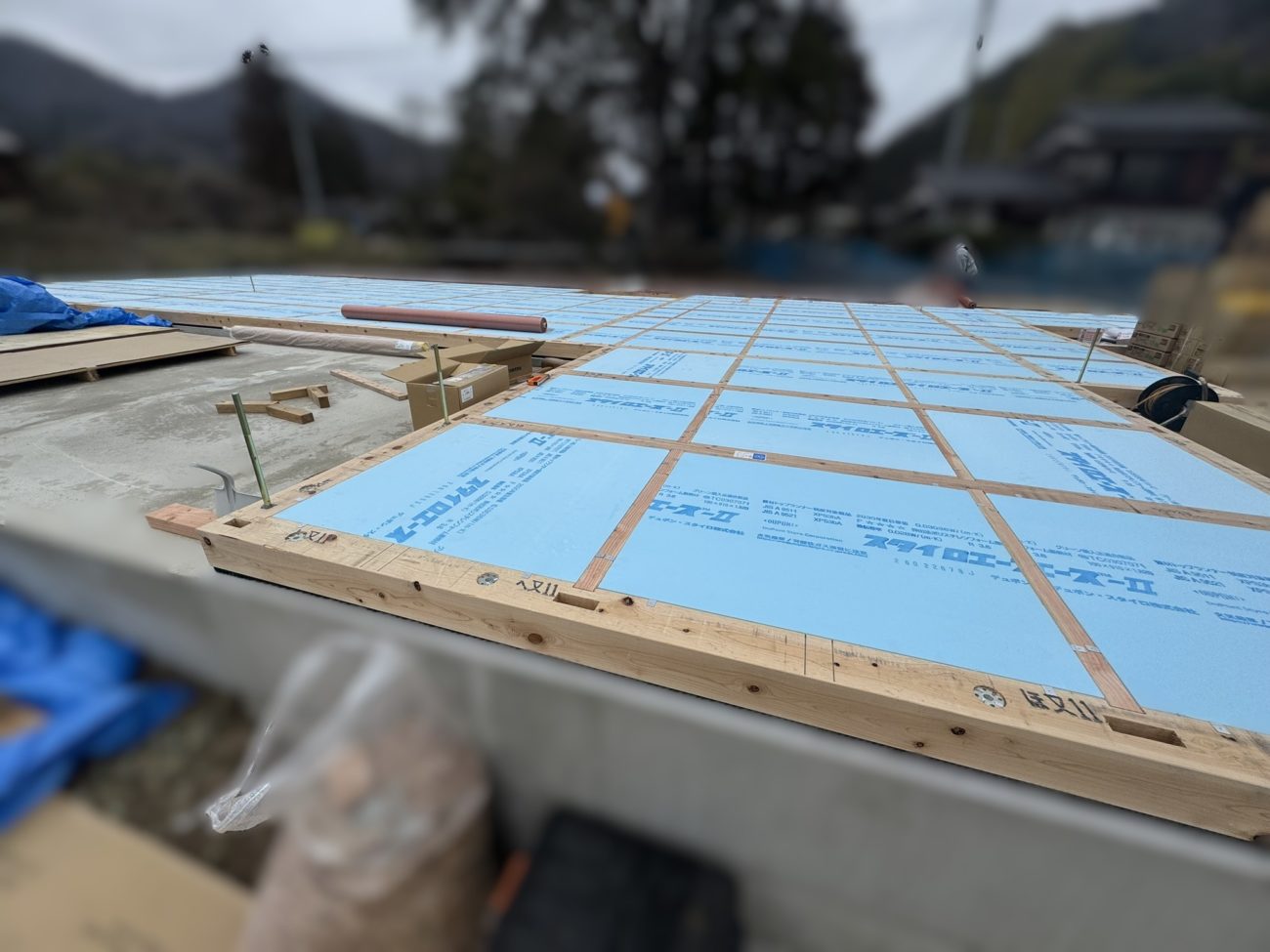 土台敷が終わると、上棟の日までブルーシートをかけて養生をします。