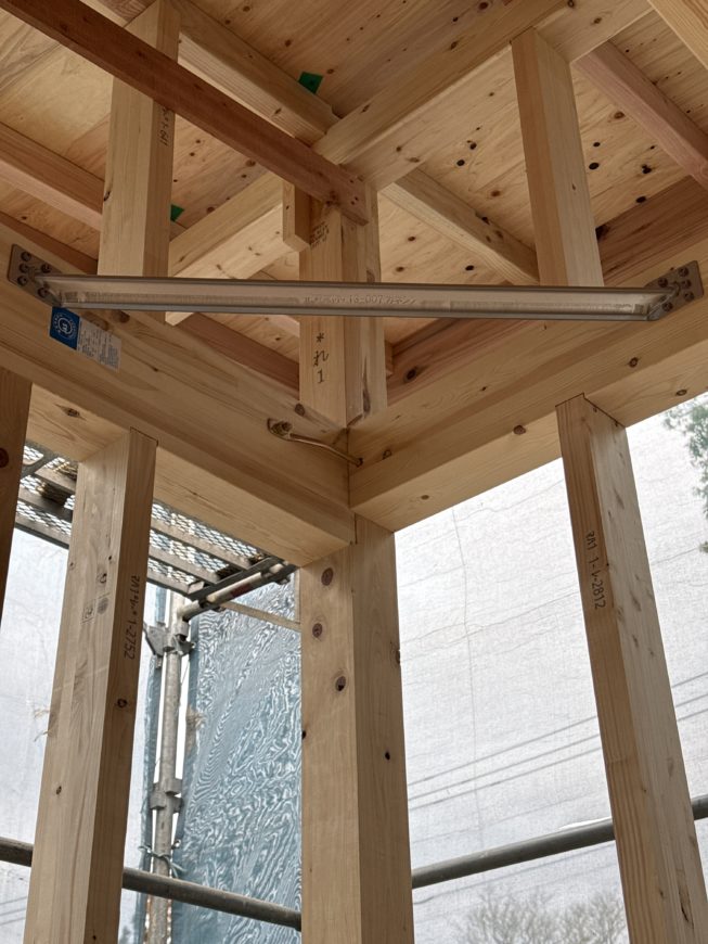 柱や梁はあらかじめ工場で接合部を凹凸になるように加工をして、互いが組み合わせられるようになっておりますが、更に金物で固定をする事でより丈夫になります。